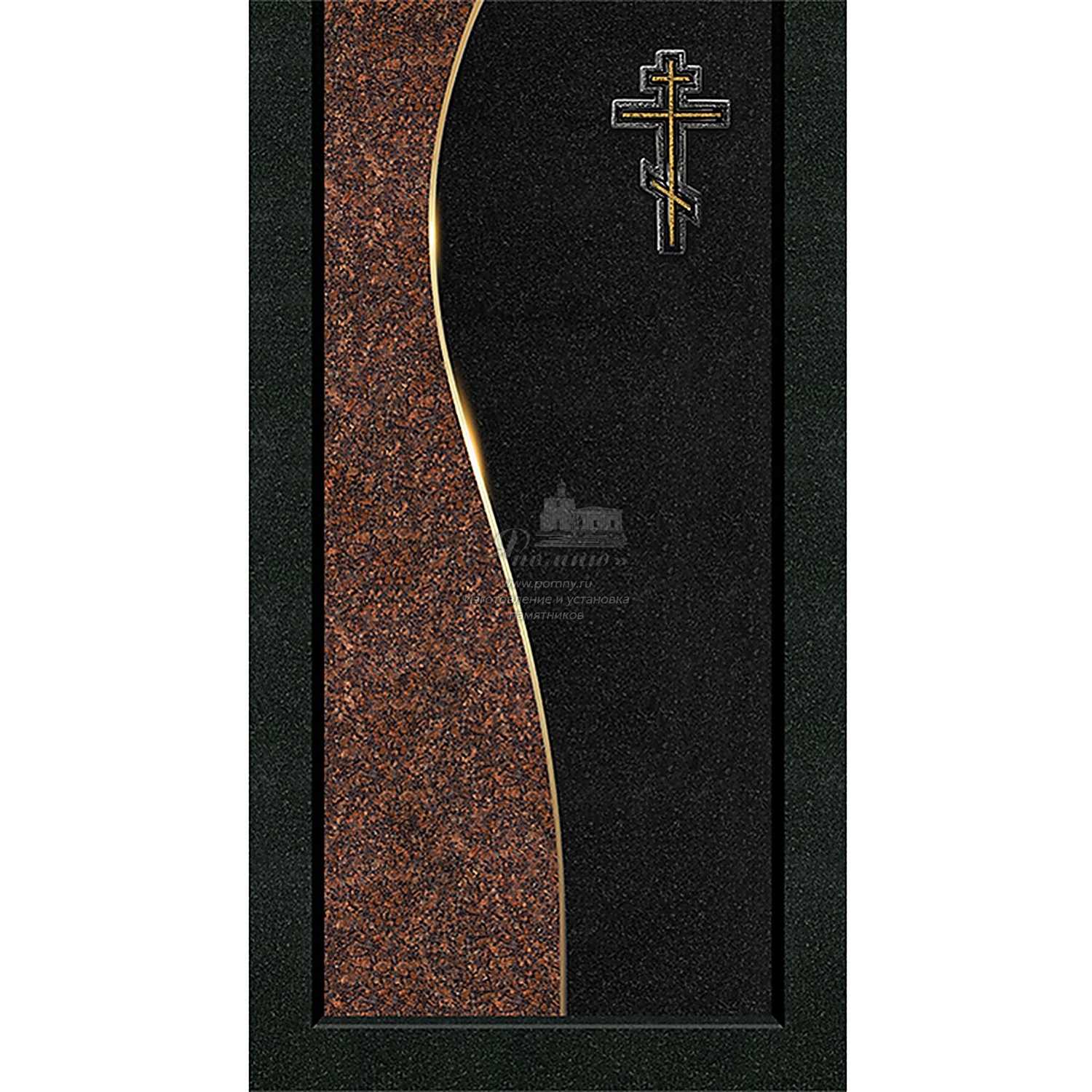 Декоративная стеклянная вкладка в цветник для гранитного памятника — сдержанное и аккуратное решение для оформления места захоронения. Модель выполнена в контрастном сочетании темного и красно-коричневого оттенков, дополнена православным крестом, благодаря чему хорошо подходит для классических мемориальных комплексов.