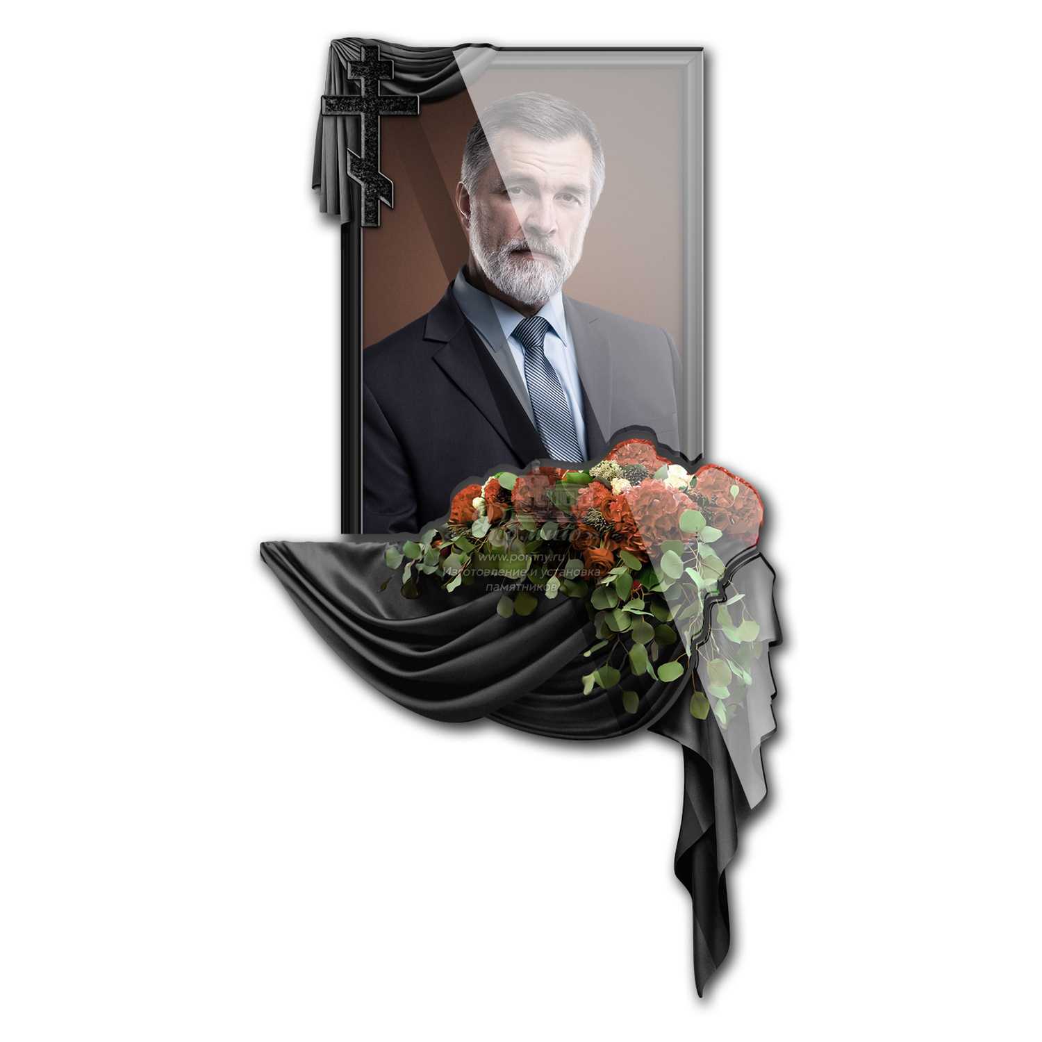 Стеклянная модульная композиция с портретом, православным крестом, черной драпировкой и цветочным декором выполнена в сдержанном мемориальном стиле. Такое оформление подчеркивает торжественность и глубину памяти, создавая выразительный образ для классического надгробия. Прямоугольная форма портрета хорошо подходит для мужских и женских изображений, а декоративные элементы делают композицию завершенной и благородной.