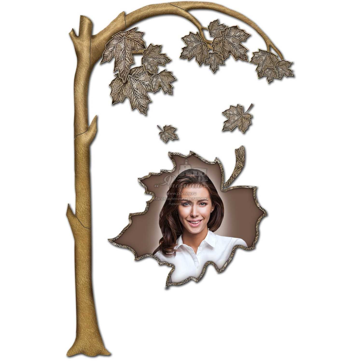 Оригинальная модульная композиция из стекла в виде дерева с кленовыми листьями символизирует жизнь, память и связь поколений. Портрет размещается в декоративной форме листа, что делает изделие особенно выразительным и нестандартным. Такая композиция подходит для художественного оформления памятника и позволяет создать индивидуальный мемориальный образ с природной символикой.