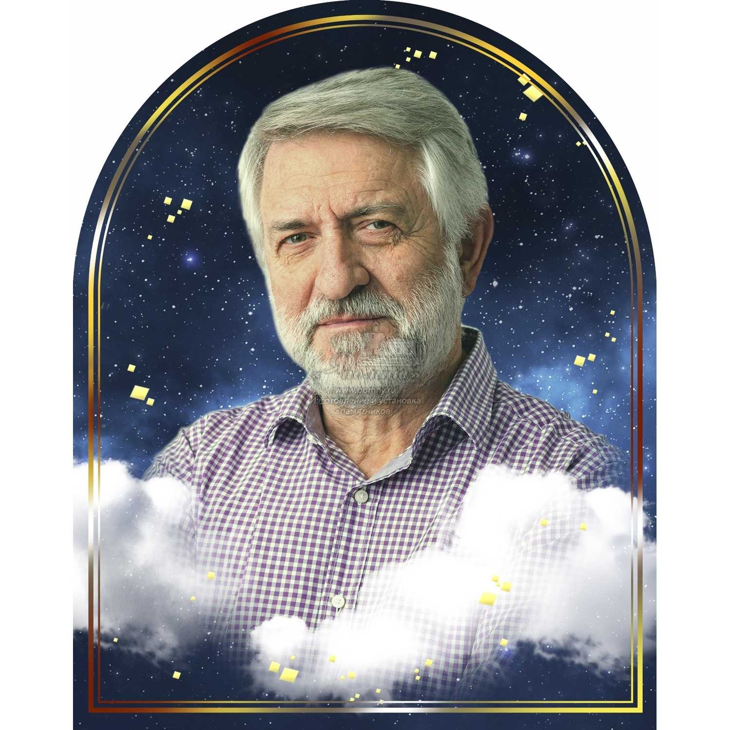 Портрет на стекле с декоративным орнаментом и небесным фоном выполнен в выразительном мемориальном стиле. Глубокий синий цвет, облака и световые акценты создают образ покоя, света и вечной памяти. Золотистая рамка с арочной формой делает изделие торжественным и благородным. Стекло толщиной 6 мм придает портрету прочность, визуальную глубину и эффектный внешний вид на памятнике.