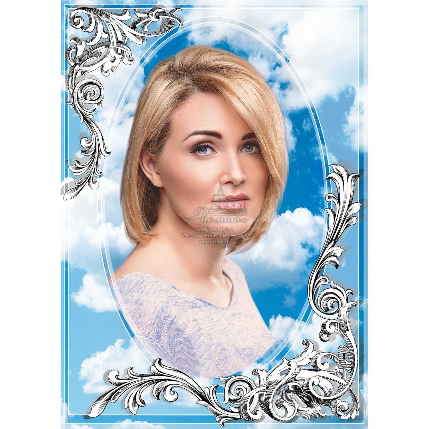 Портрет на стекле с облачным небесным фоном и серебряным растительным орнаментом выглядит светло, воздушно и торжественно. Светлый фон подчеркивает мягкость образа, а декоративные элементы делают композицию более изящной и завершенной. Такой вариант отлично подходит для женских портретов и для оформления памятников в спокойной, благородной стилистике.