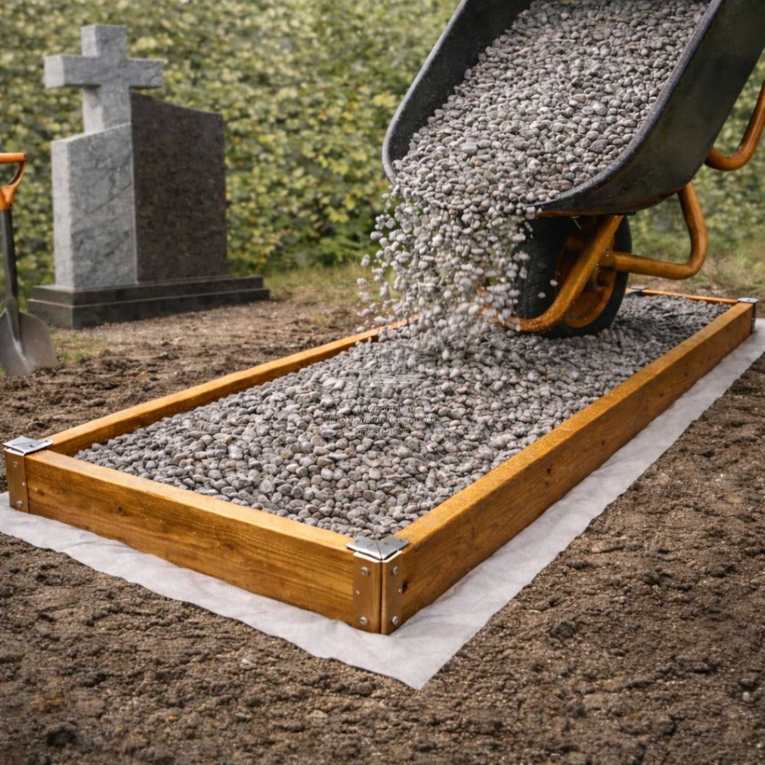 Подсыпка могилы щебнем фракции 5–20 мм на геоволокно с деревянной опалубкой — практичное и долговечное решение для благоустройства захоронения. Геоволокно препятствует прорастанию сорняков, щебень формирует аккуратную и чистую поверхность, а деревянная опалубка придает участку законченный вид. Дерево дополнительно обрабатывается лаком и антисептиком для защиты от влаги и продления срока службы.