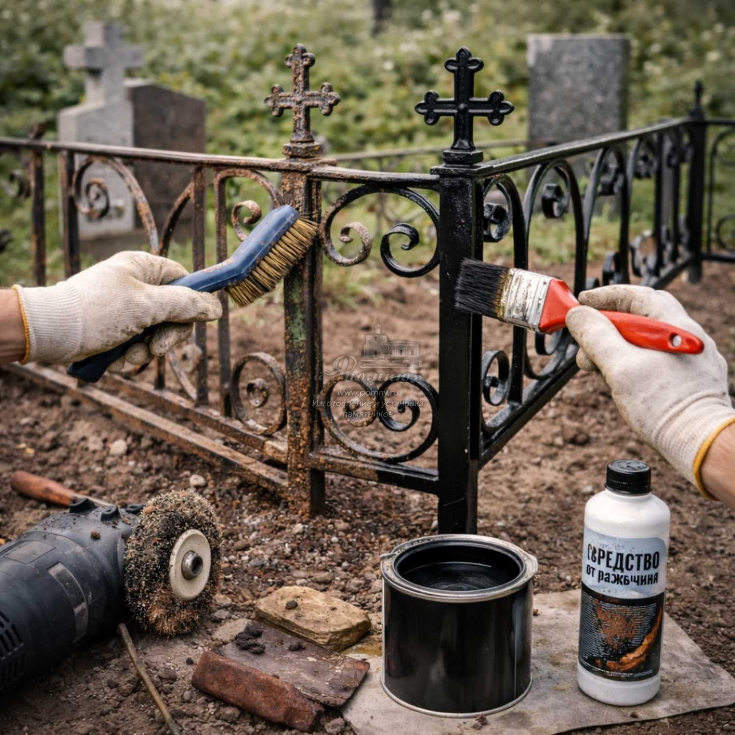Покраска ограды на могильном участке позволяет обновить внешний вид металлического ограждения и защитить его от дальнейшей коррозии. Перед окрашиванием выполняется очистка поверхности, удаление ржавчины и подготовка металла. После покраски ограда выглядит аккуратно, ухоженно и лучше сохраняется под воздействием осадков и перепадов температуры.