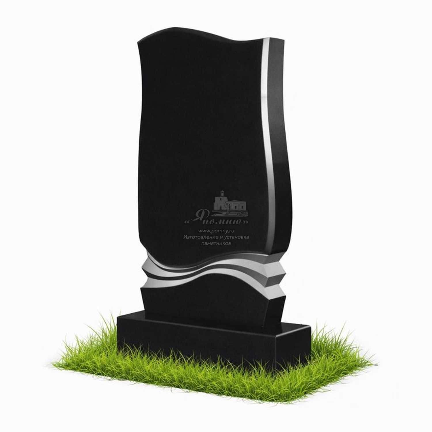 Памятник «Серебряный изгиб» отличается выразительной формой с плавной вертикальной линией и декоративным волнообразным элементом в нижней части стелы. Контрастная обработка гранита подчёркивает глубину формы и придаёт памятнику благородный, запоминающийся облик, оставаясь при этом сдержанным и уместным для мемориального пространства.